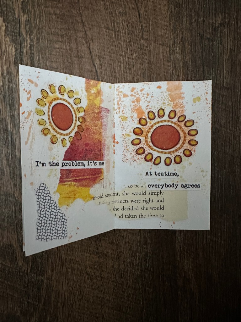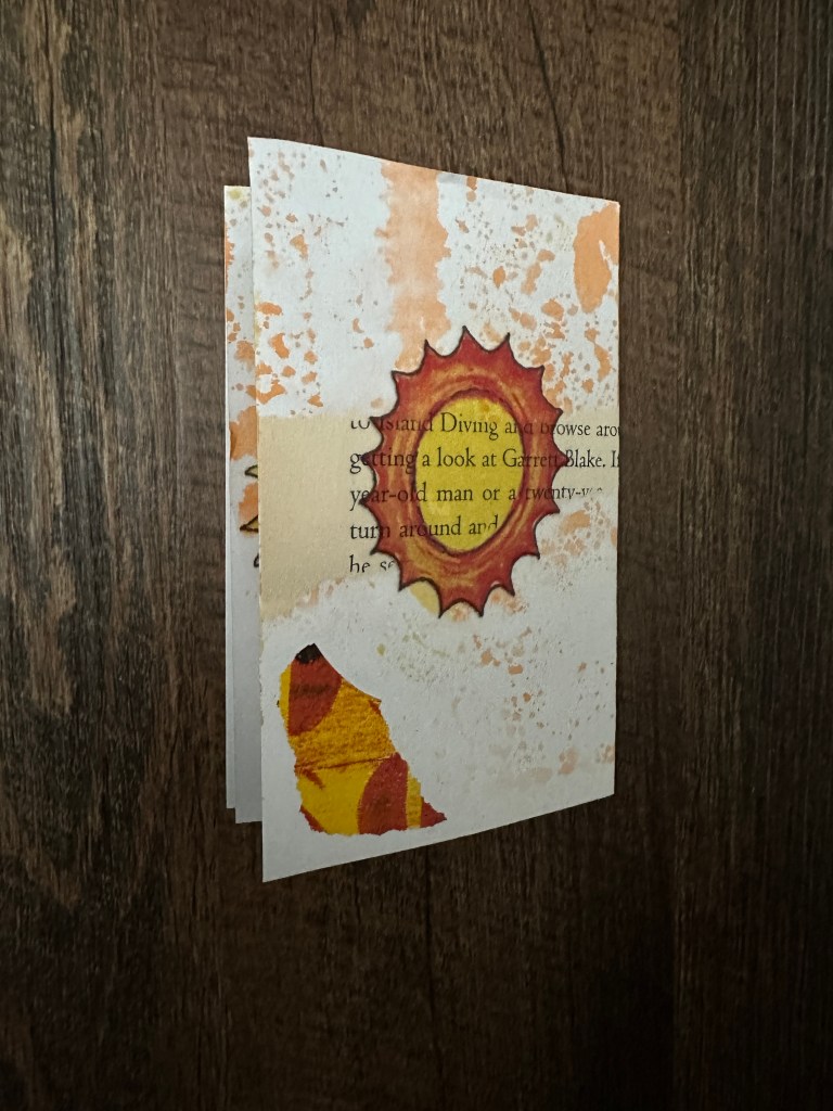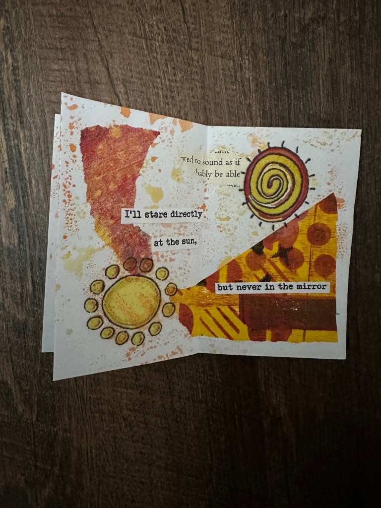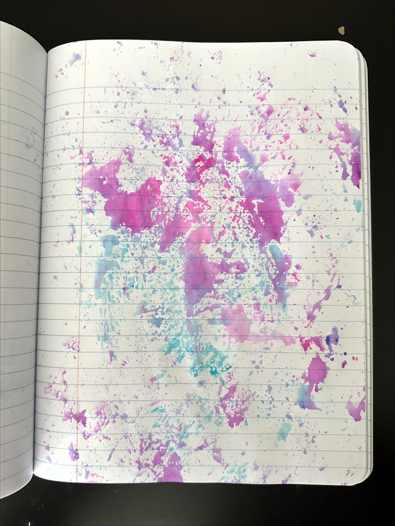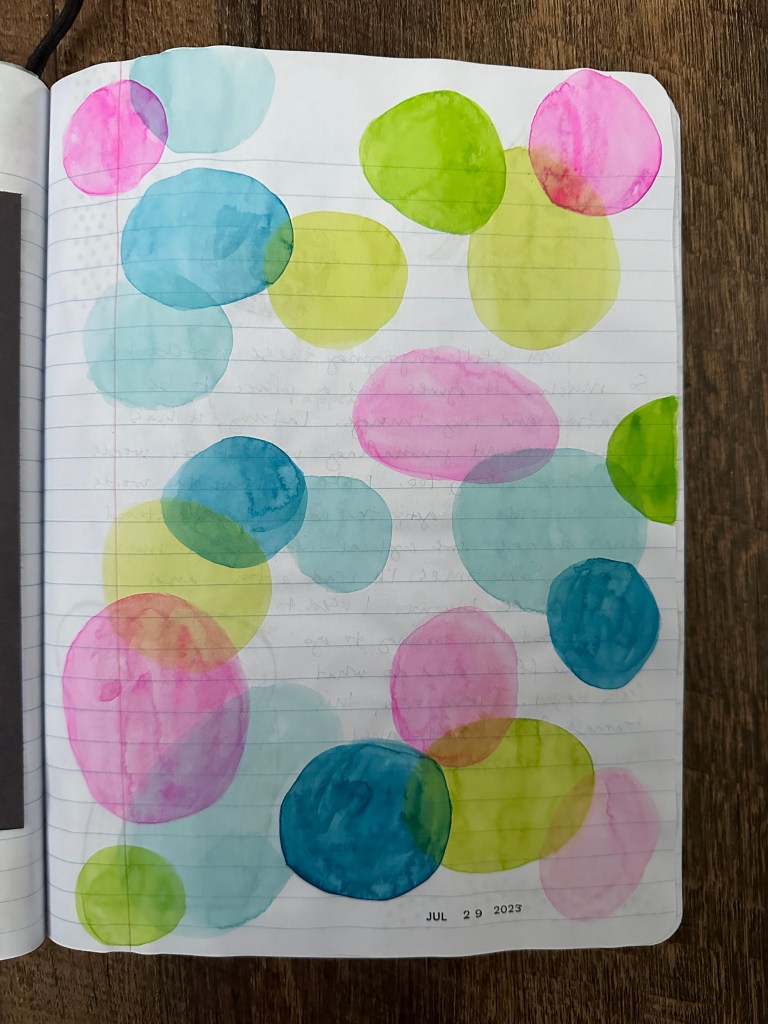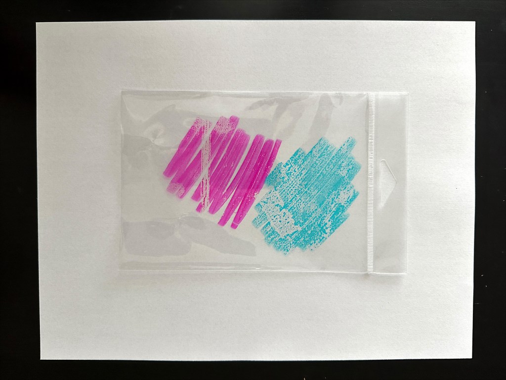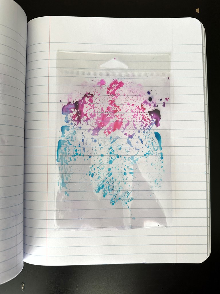 Pick up the plastic and smoosh it on to your notebook page or whatever paper you’re using. When I want my colors to mix, I fold the plastic a little before smooshing to let the colors come into contact. That’s what I did here.
