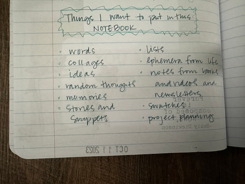 Give yourself permission. Start a new notebook, decorate your cover, or begin a new page with something from your list. Take it and make it yours.