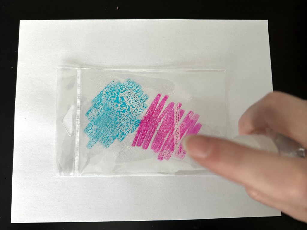 Scribble your marker(s) on the piece of plastic. There are really no rules here. You can use one or two or five colors – whatever your want. I like to use two primary(ish) colors that make a third color. Here, I’ve chosen a pink and a blue that will combine to make a nice purple.