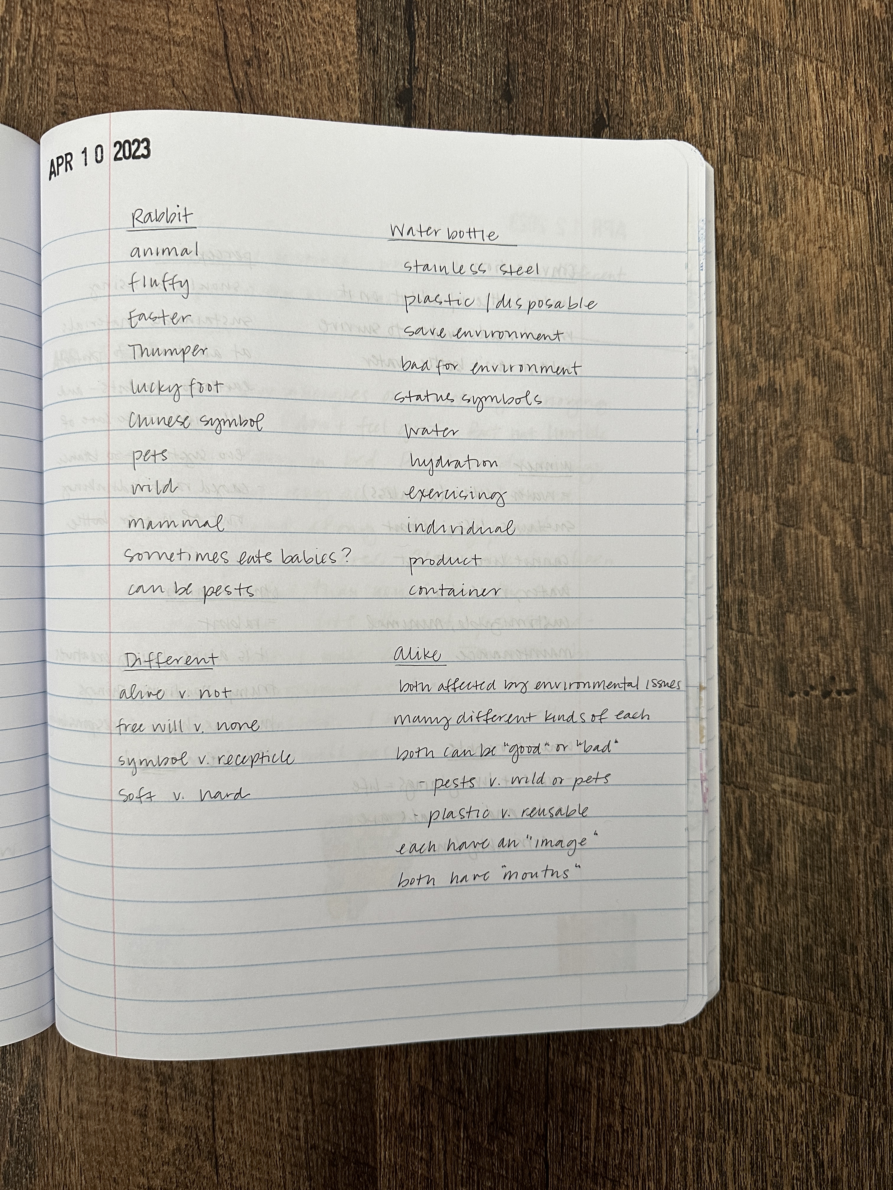 While these two questions are similar, they can result in very different responses. For the first question, I focus on the words. I put the two items in conversation with each other by considering the words together: “rabbit water bottle.” What does that make me think of? Then I switch the order: “water bottle rabbit.” How does that change things? I write down anything that comes to mind, trying not to edit my thoughts.