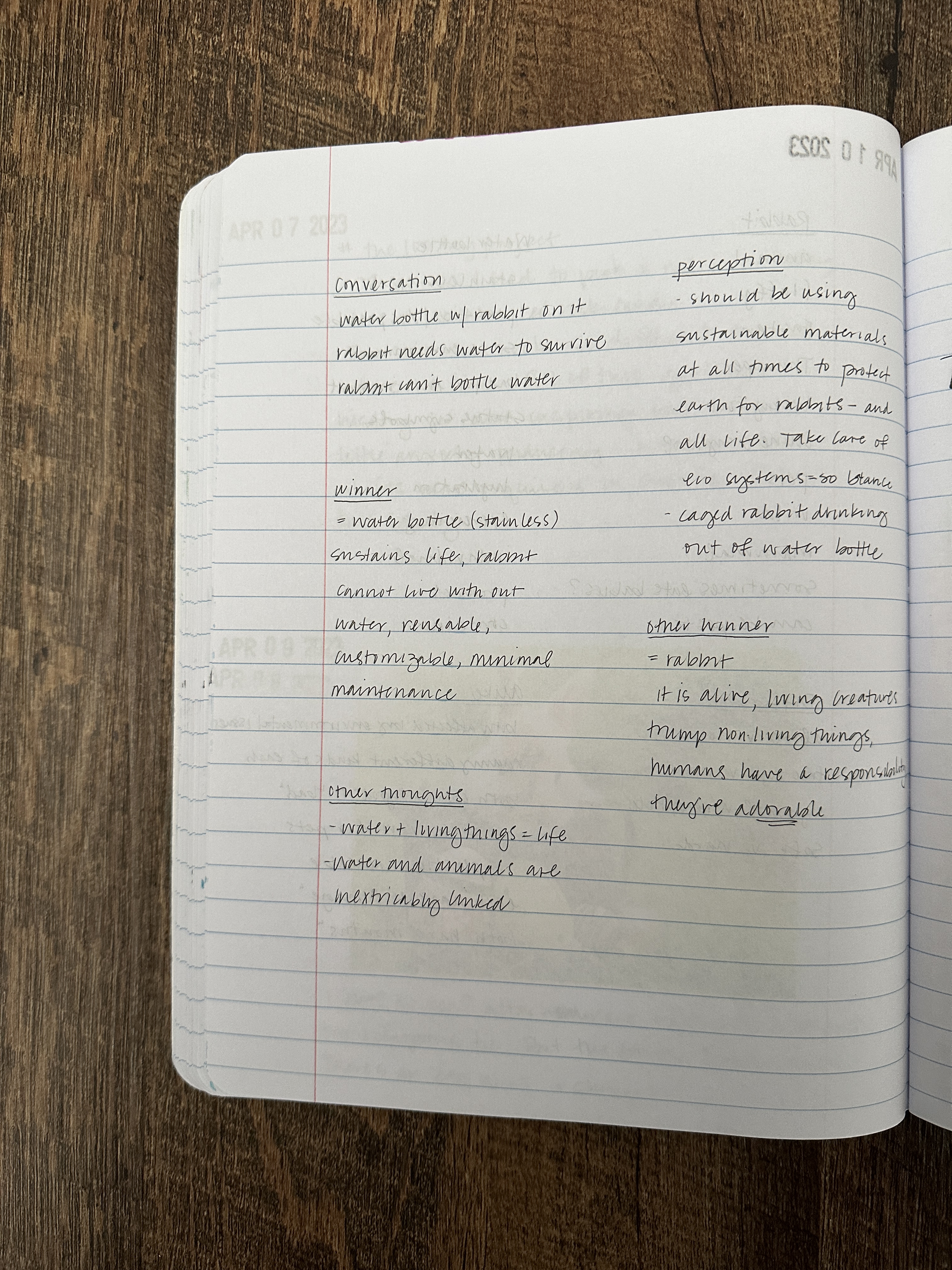For the second question, I focus on the visuals, seeing if, like the color example above, my perception changes when the two items are physically next to each other. I visualize the rabbit next to the water bottle. Write down my impressions. Then I consider the water bottle next to the rabbit.