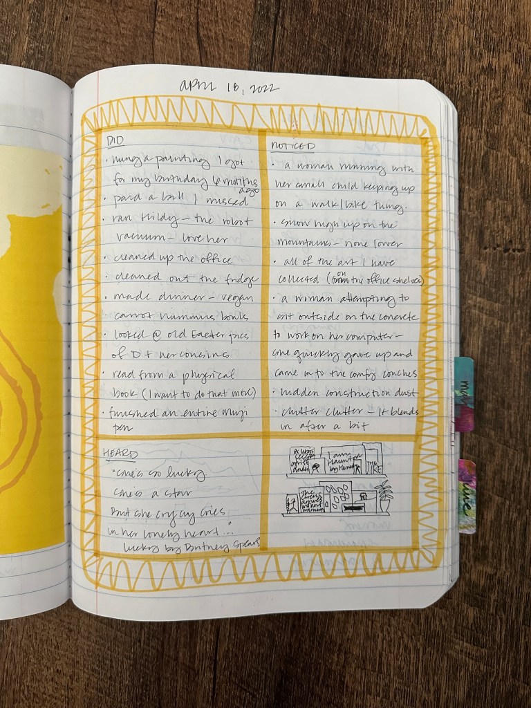 When I do this exercise consistently, I’m surprised at how it hones my powers of noticing. Even now, when I go back through the entries even months later, I can “see” most of the things I wrote down.