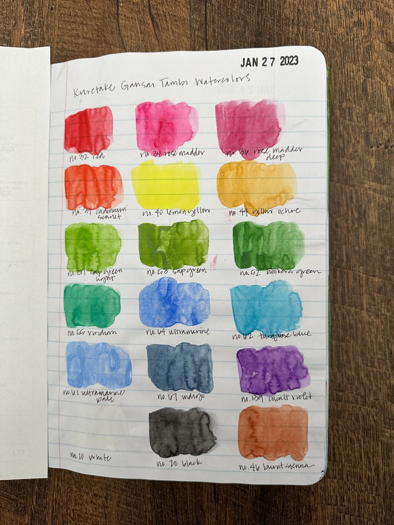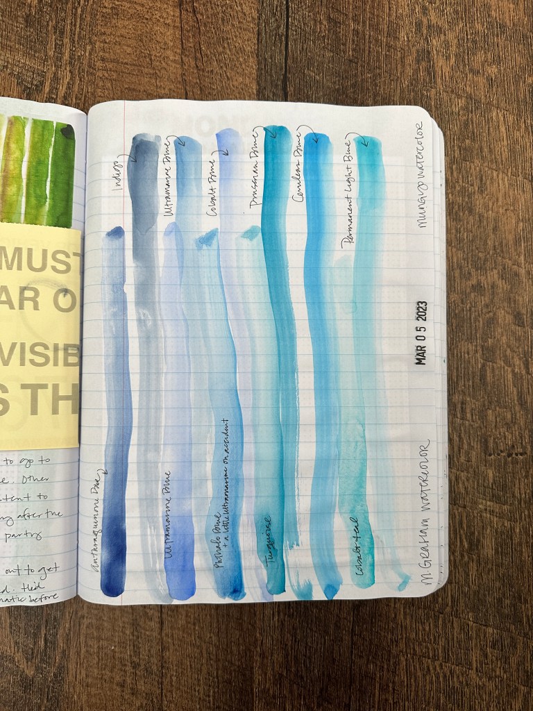 I pull out this exercise often: when I’m stuck, when I start a new notebook, when I get a new supply, or, shockingly, when I actually need swatches of something. This is a good one to keep in your arsenal.